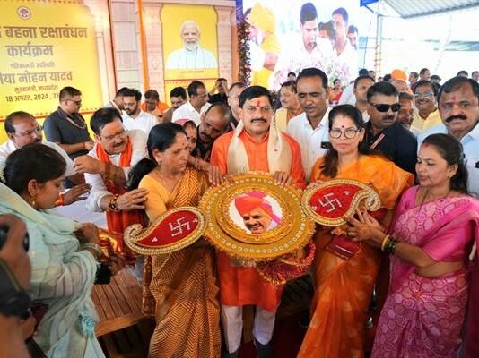 मुख्यमंत्री डॉ. यादव की कलाई पर बहनों ने बांधी राखी बहनों को झुलाया झूला और पुष्प-वर्षा कर किया स्वागत